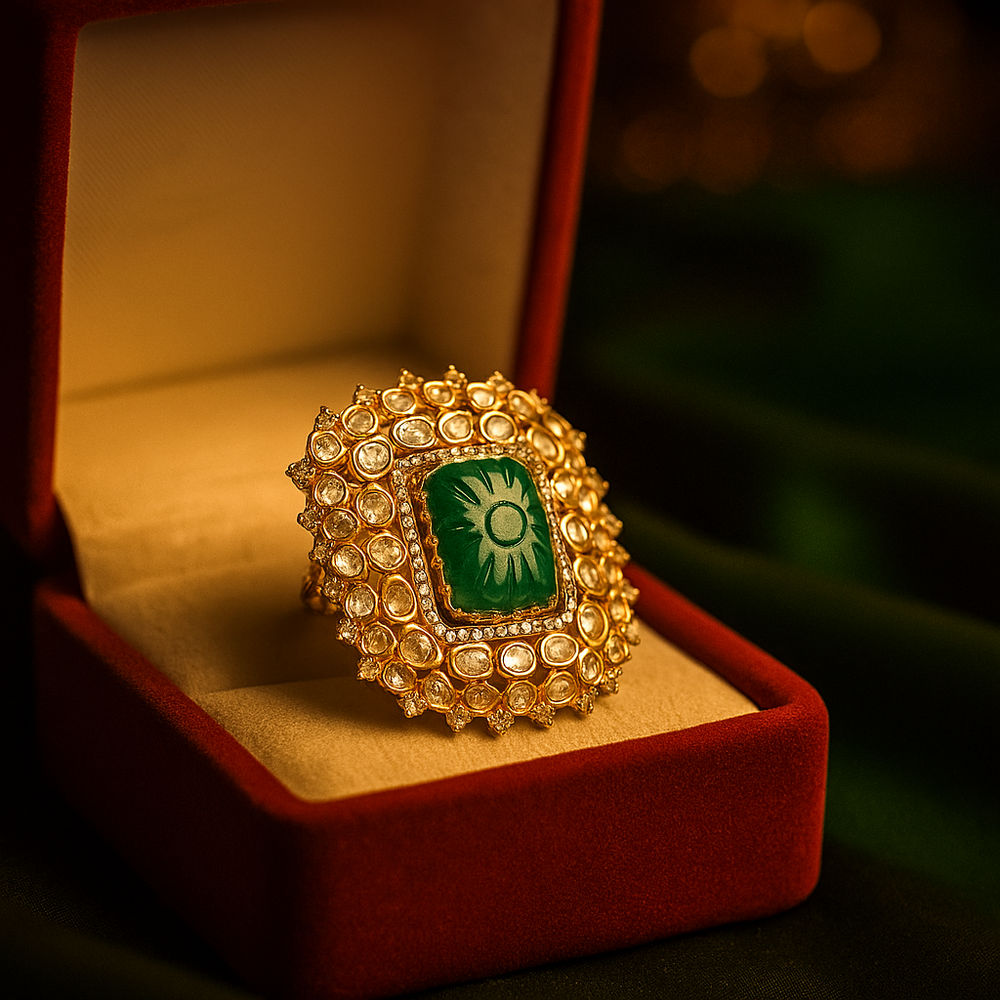 A high-definition close-up of an intricately crafted 925 silver ring, luxuriously gold-plated and adorned with a central Moissanite Polki stone surrounded by vibrant, multi-colored gemstones. The ring is placed on a soft, neutral-toned velvet cushion, with warm ambient lighting that highlights the brilliance of the moissanite and the rich gold finish. The adjustable band is subtly visible, showcasing its flexibility and craftsmanship. In the softly blurred background, elements like antique gold accents, silk fabric, or traditional Indian motifs add a regal, festive feel—perfect for weddings, special occasions, or statement styling.