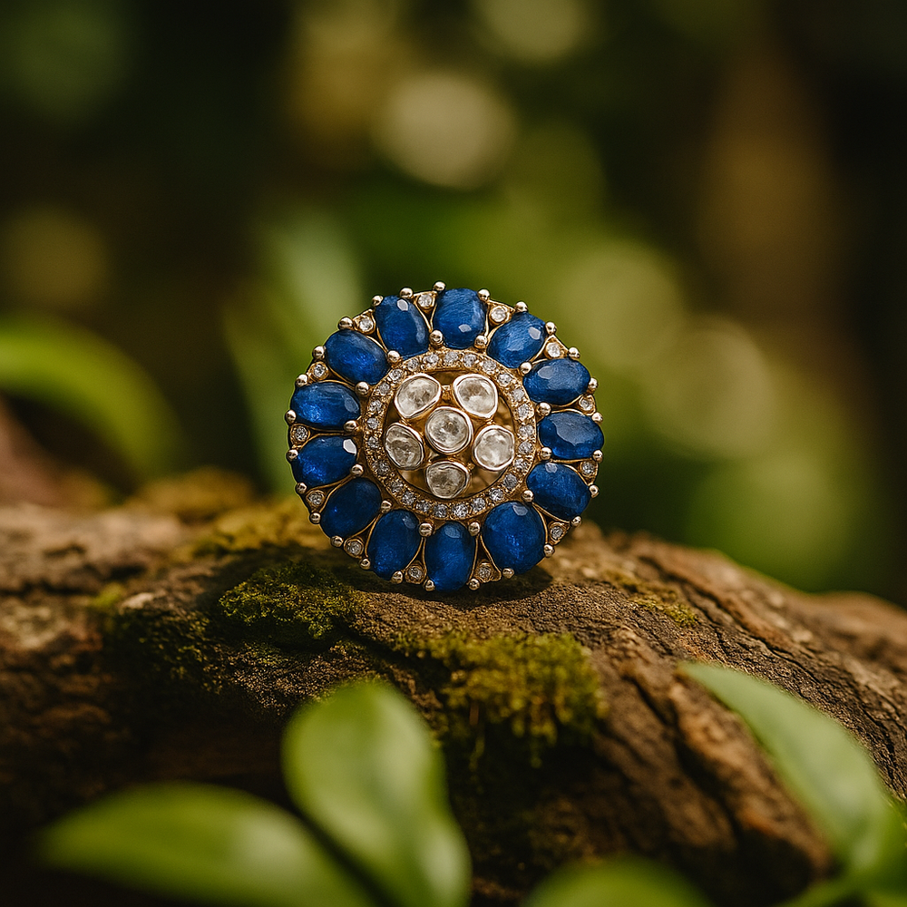 925 Silver Moissanite Polki & Cubic Zirconia Blue Stone Ring – Product