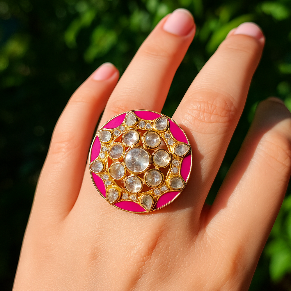 A dramatic close-up of a luxurious 925 silver ring, richly gold-plated and featuring a radiant Moissanite Polki centerpiece surrounded by deep red cubic zirconia stones. The ring is placed atop a rich maroon silk cloth with traditional gold embroidery, evoking a regal and festive bridal aura. Soft, warm lighting enhances the brilliance of the moissanite and the fiery sparkle of the red CZ accents. The adjustable band is subtly displayed, highlighting the handcrafted design. In the softly blurred background, hints of a bridal dupatta or ornate jewelry box complete the scene, creating a perfect setting for wedding and celebration jewelry.